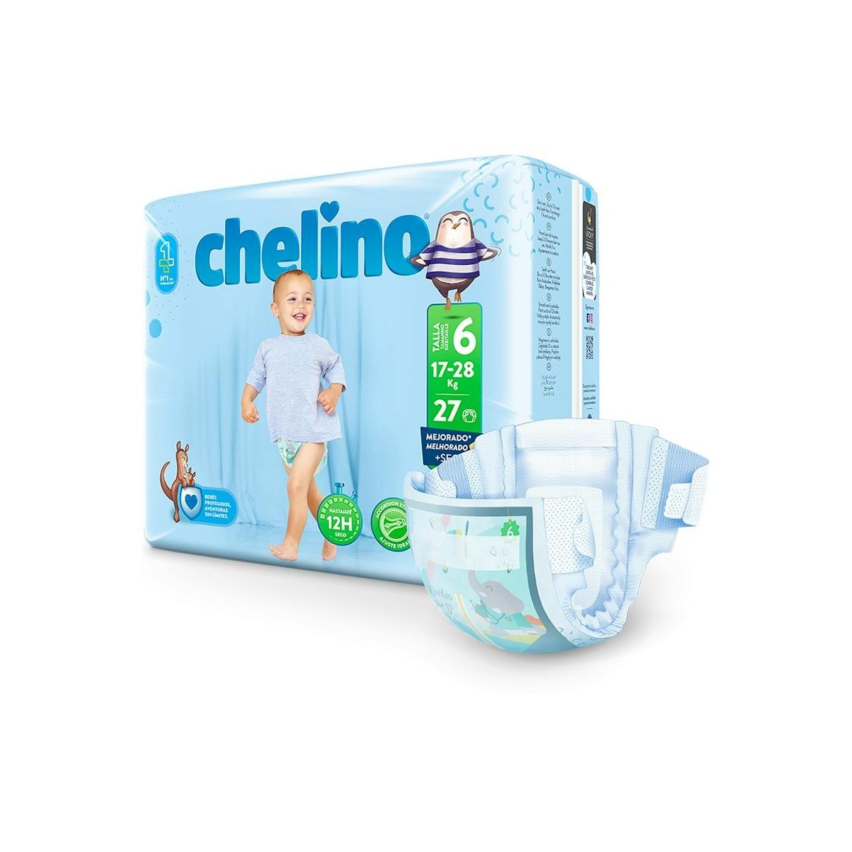 Pañales Chelino talla 6 diseñados para la protección y el cuidado de la piel del bebé de 17 a 28 kilos.